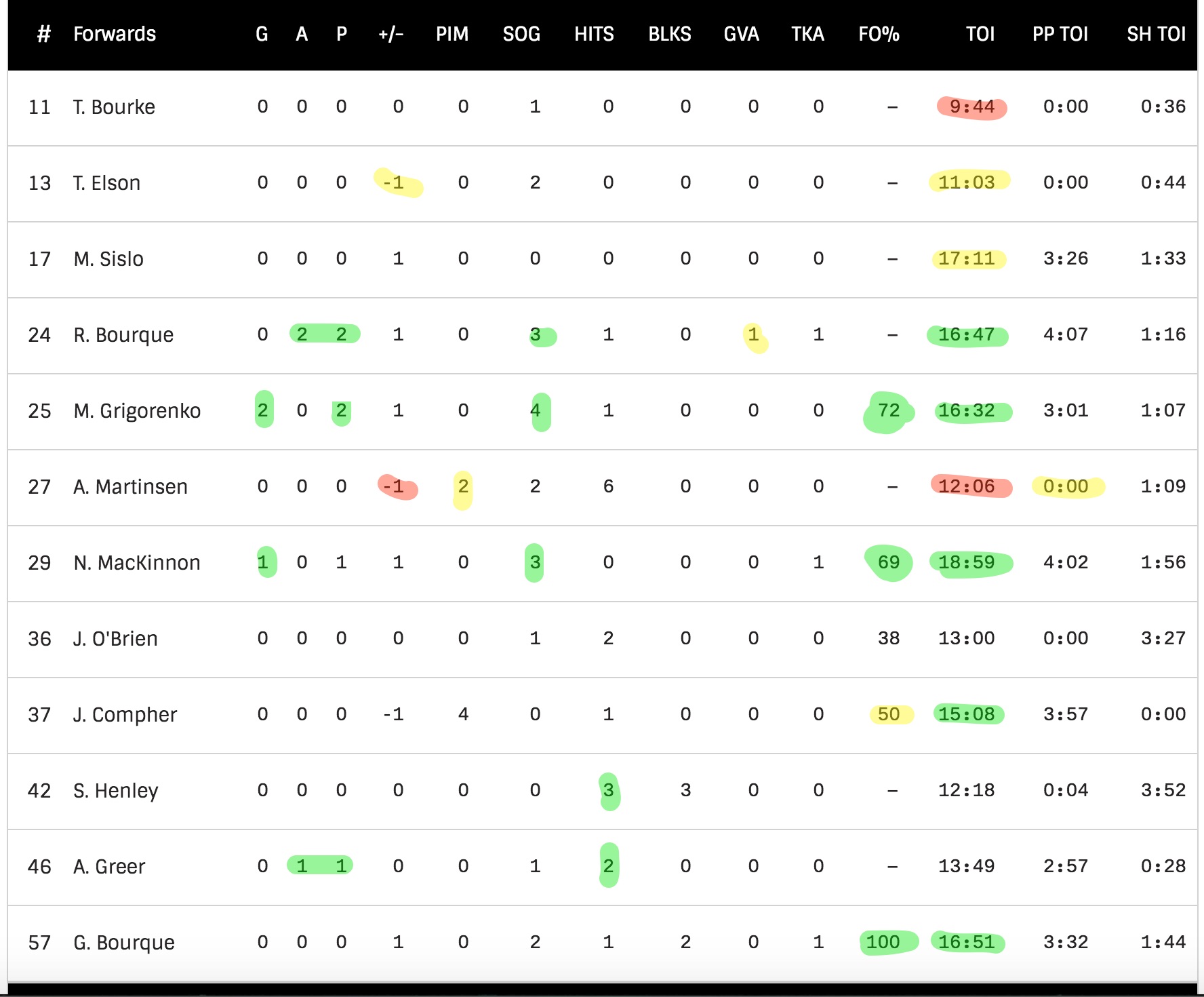 - G. Bourque with an impressive number on the dots but he might have only taken one faceoff and won it, for all I know.
