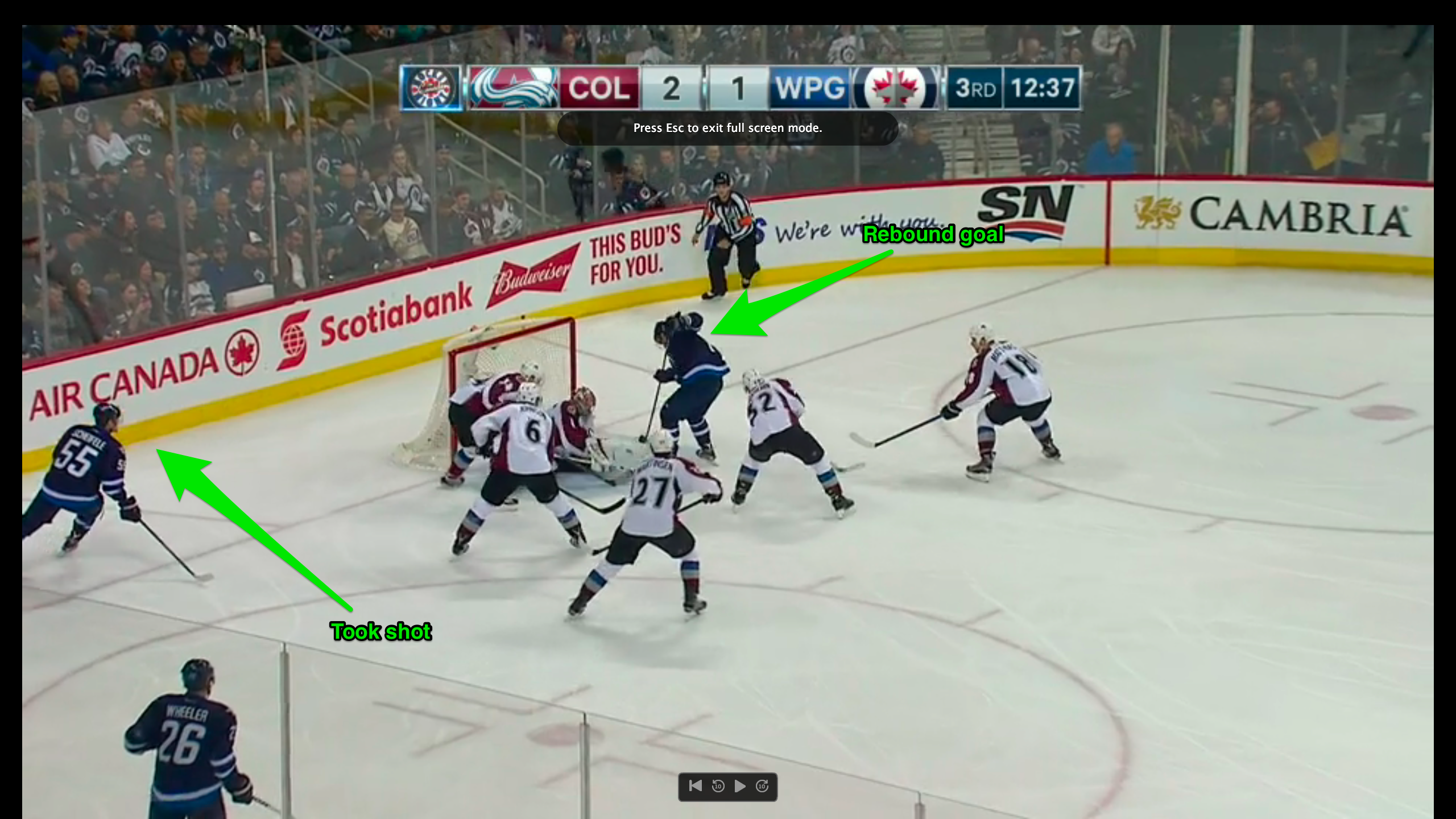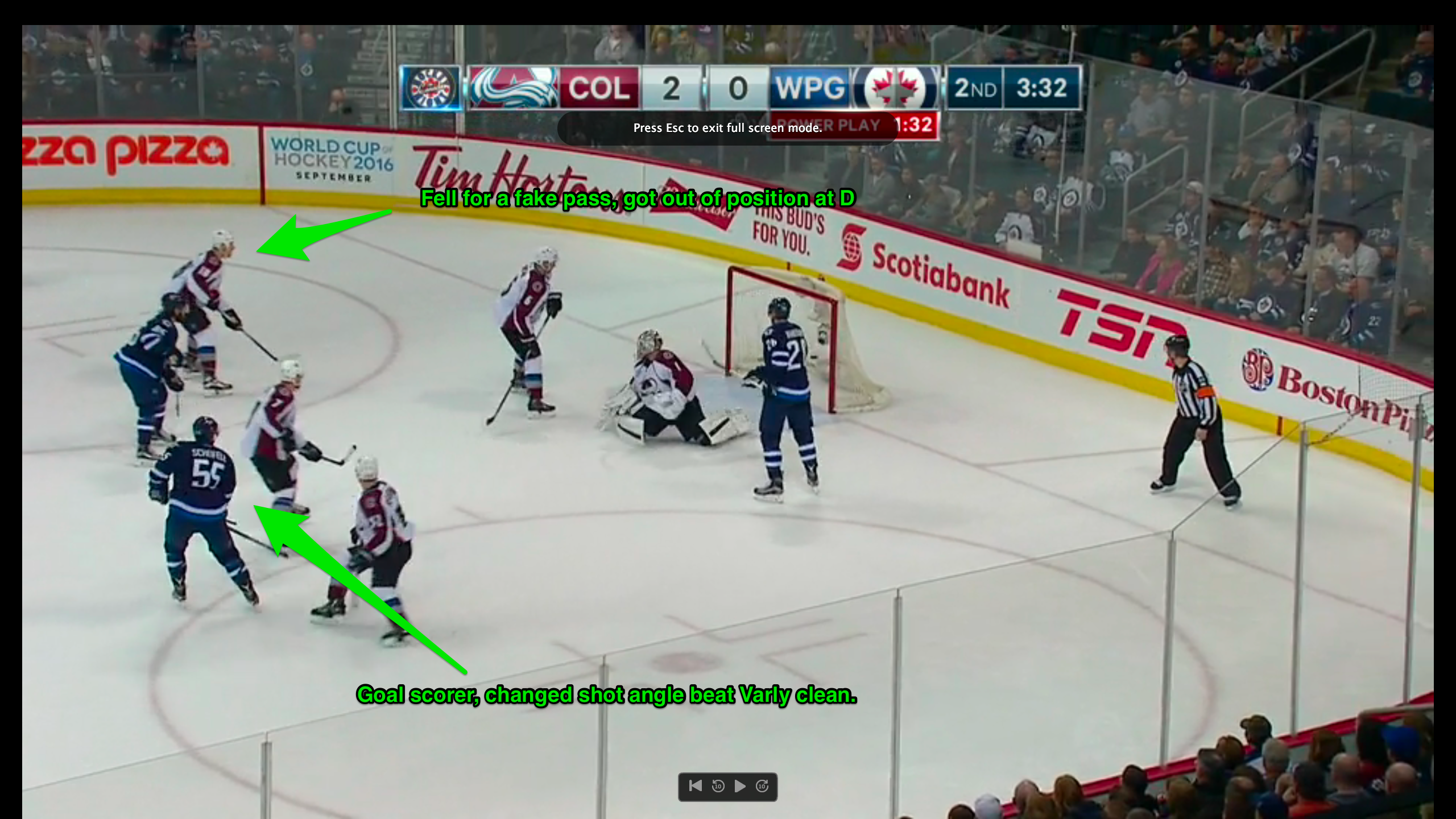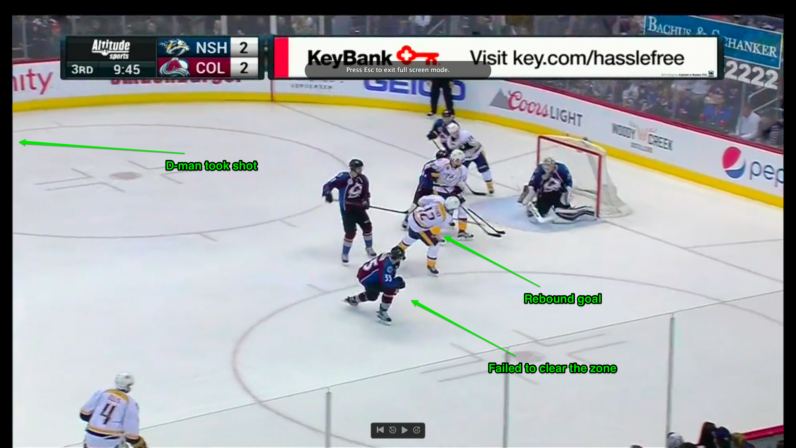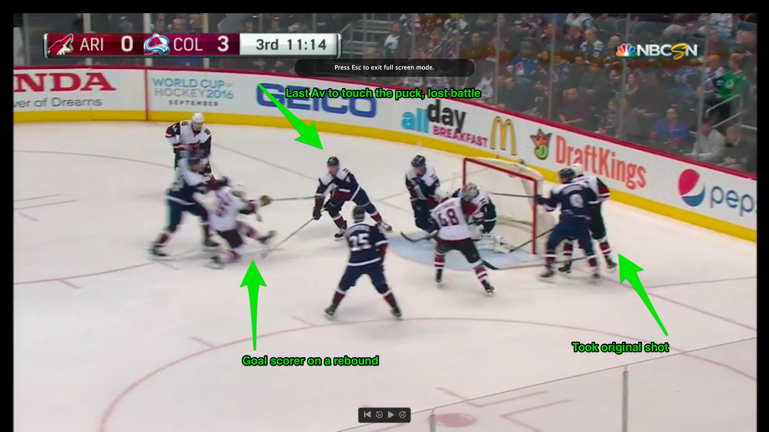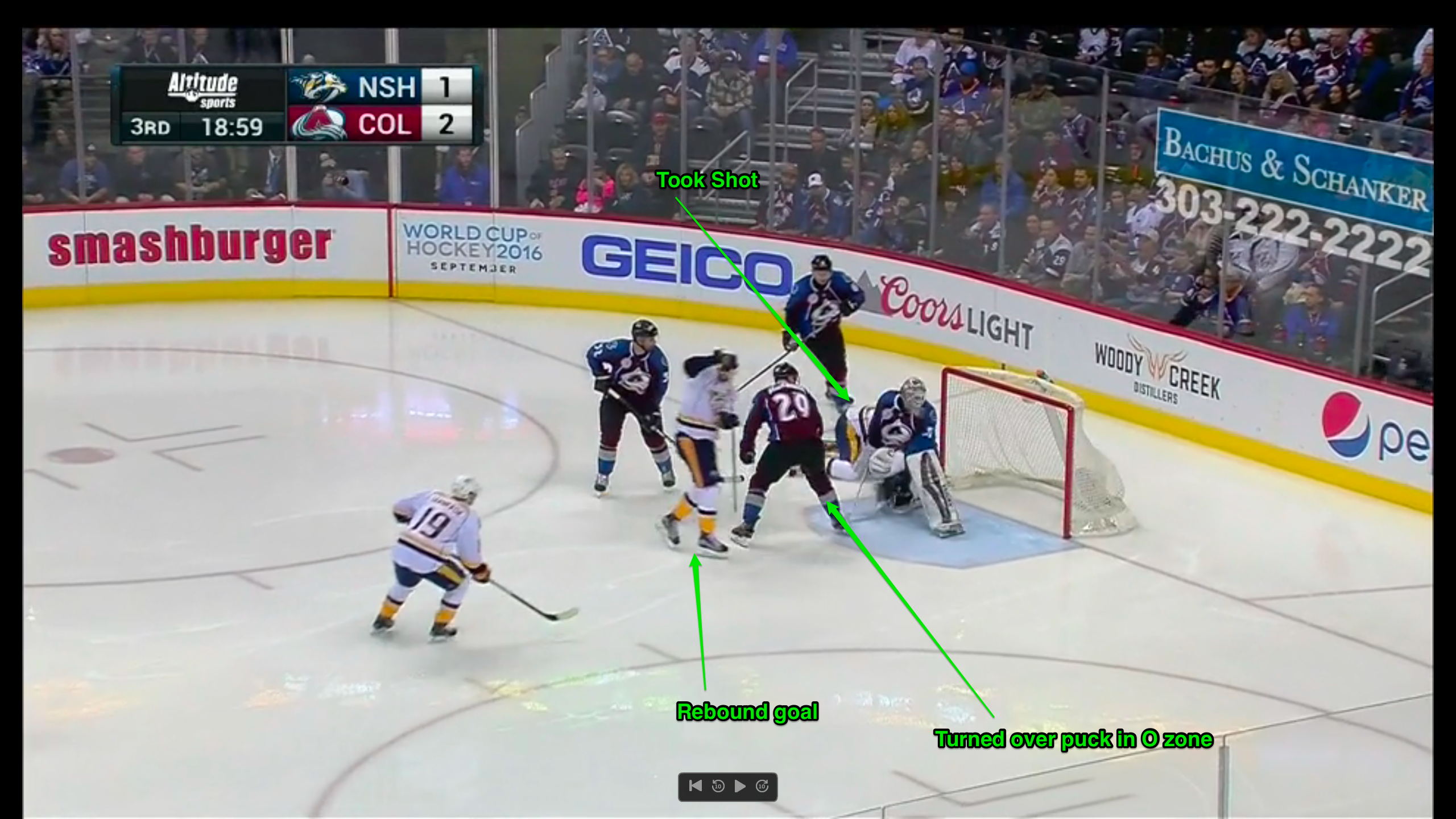 Another rebound goal (3rd of theme) after a failed clearing attempt from Cody McLeod on the boards. To say that the Avs goalie should control the rebounds is accurate…. But the Avs players need to chip in as well and clear their guy out of a rebound chance.