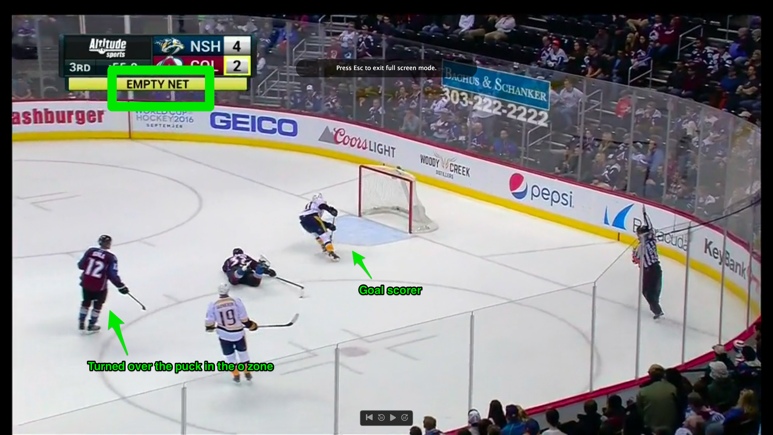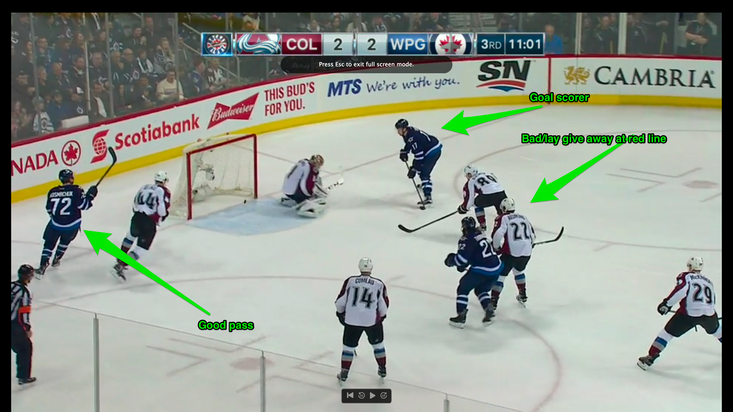 A bad and lazy pass that leads to a turnover and a clean pass as the Avs look on… no where near the net.