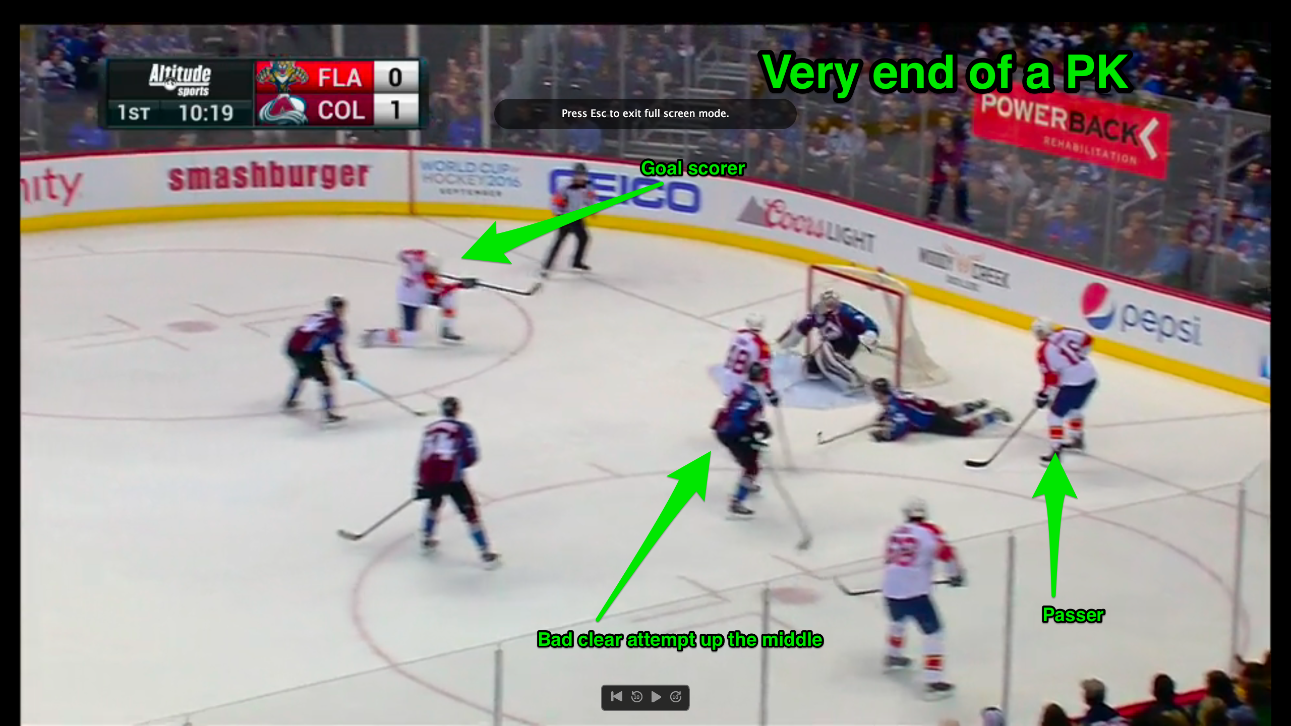 After a bad clearing attempt, was the penalty was ending Florida recovered the puck and caught some Avs players off guard as they thought the puck was being cleared by Bigras.