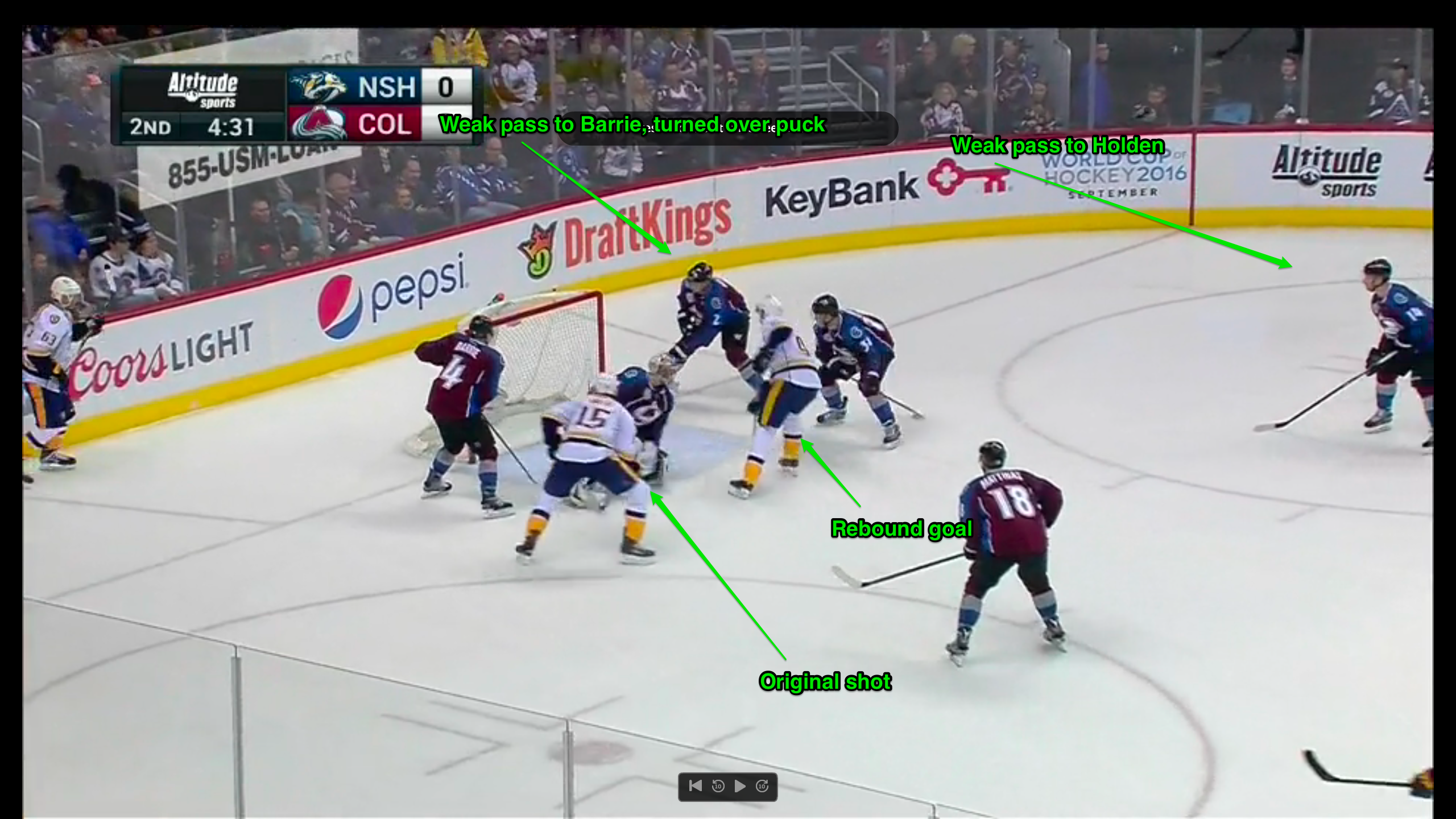 Two weak passes lead to a point blank shot and then rebound goal as 3 Avs players in punching distance watch the happenings.