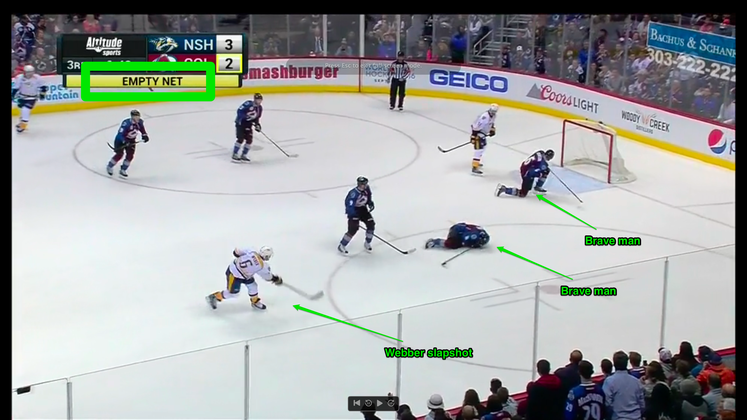 Webber winds up with zero hesitation or hold-back AS Tyson Barrie and Eric Johnson risk life and limb standing in front of the hardest shot in the game today.