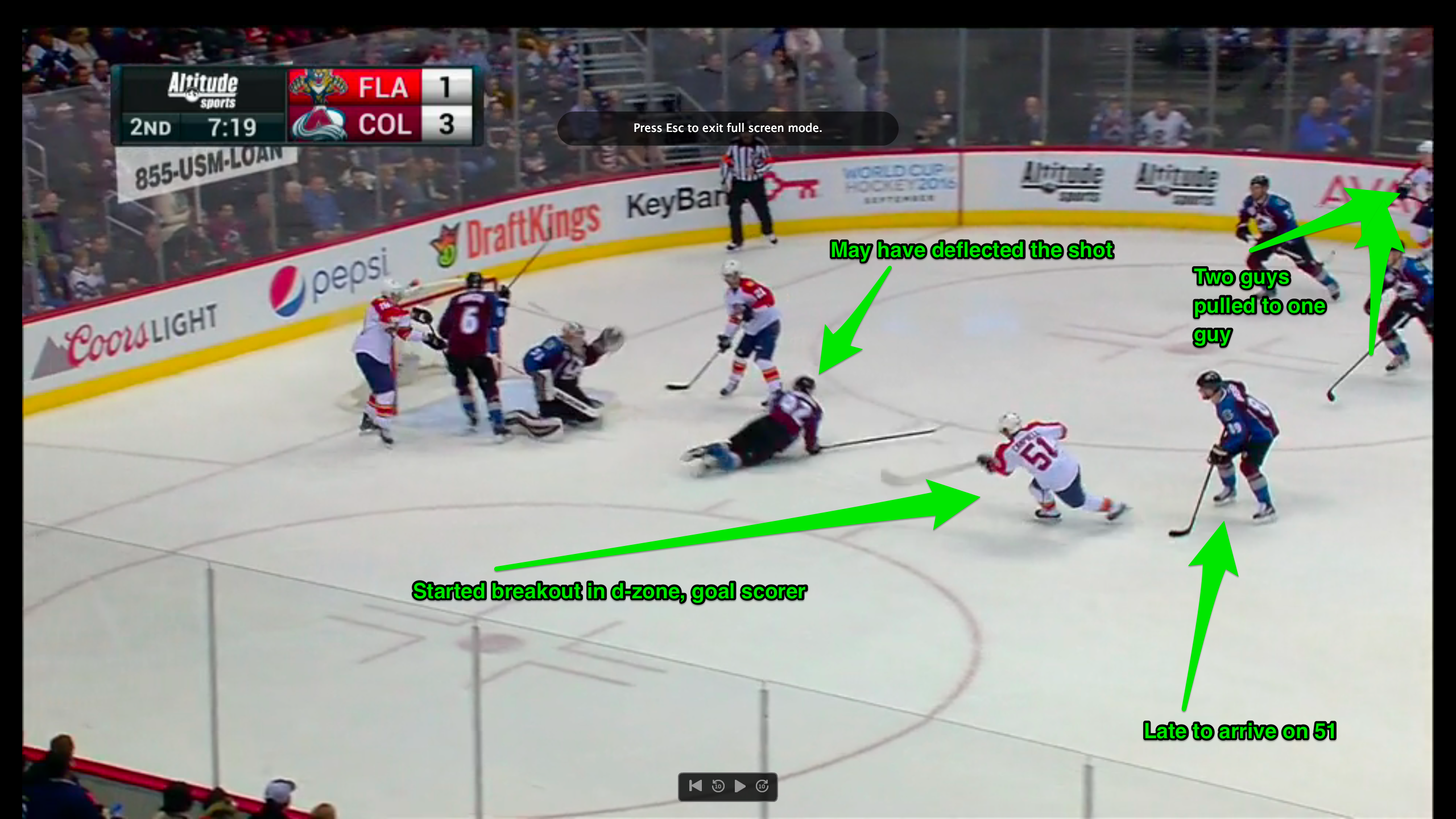 A clean goal scored by a man left wide open when two Avs players attacked the same Florida player. It looks as though Landy may have redirected the shot while trying to block it.